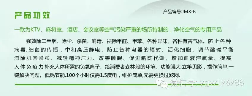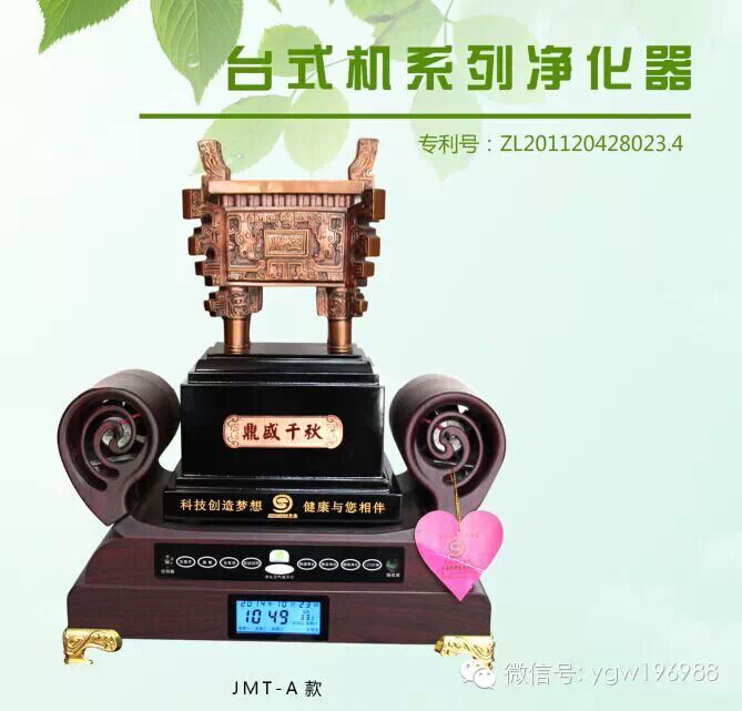 玖木空气净化产品利用打雷闪电的原理,采用大自然空气为原料,通过专利独有、采用最新研发的脉冲式电路和超导材料及纳米技术升为安全的直流负高压,利用高压端的碳纤维尖端对空气放电,电离空气,生成带负电荷的离子,与空气的氧瞬间结合,起到增氧灭菌、除尘抑毒、彻底除二手烟、除PM2.5污染源 等净化空气的功能。在医学界:负离子被称为生命中的“还原离子”空气中的“维生素',负离子=长寿素。负离子还具备调节人体酸碱平衡,促进血液循环、增强新陈代谢,提高人体的机体免疫力,起到养生保健的作用